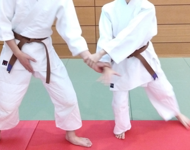 ①足を動かす→ 両手で一本の手をつかまれた時、 手は放っておき、入り身で背面から崩す。